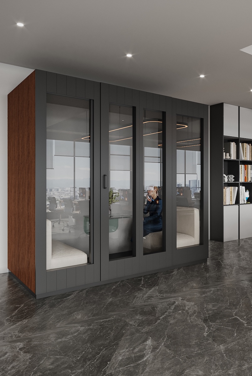The Office Pod provides a private setting suitable for meetings, phone calls, or podcast recording. It offers a distraction-free environment, thereby enhancing the ability to concentrate on tasks at hand.